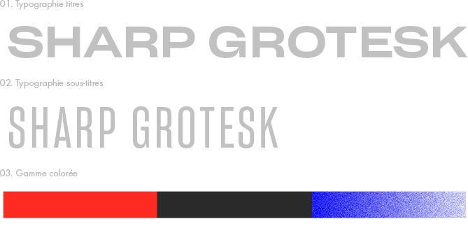 La typographie « Sharp grotesk » et les cartouches dégradés amènent de la structure tandis que les éléments graphiques faits-mains (peinture numérique sur photo et vidéo) apportent un aspect franc et impulsif.