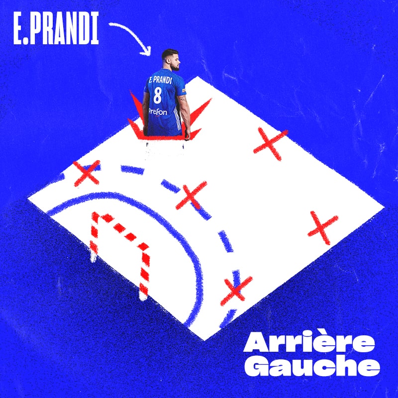 Les gimmicks graphiques (ronds, croix, traits…) ponctuent les créas et humanisent le branding : il pourrait s’agir d’annotation tactiques de l’entraîneur ou des prises de notes des joueurs en vue des match à venir…