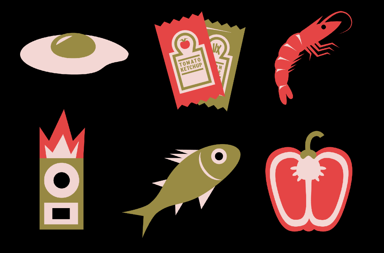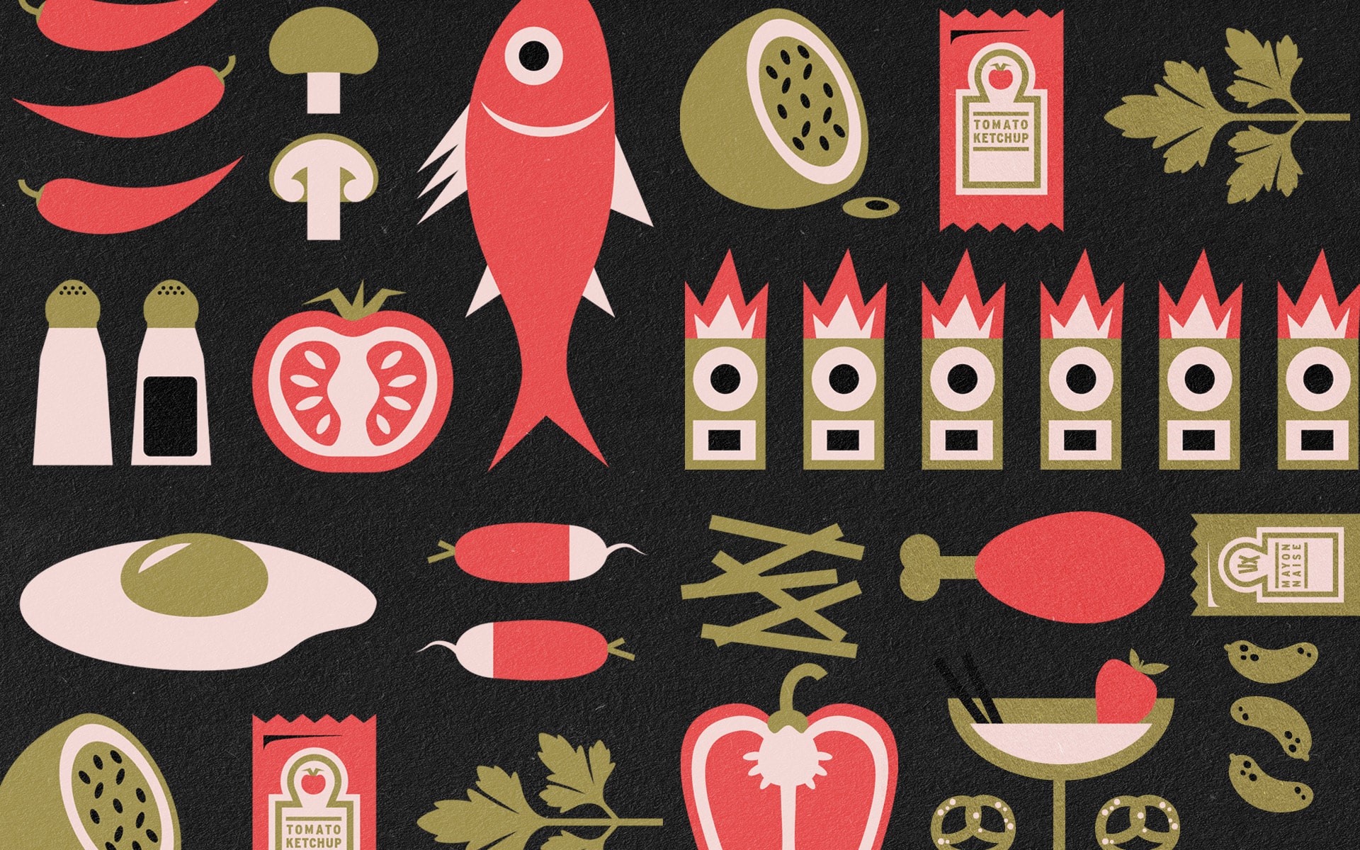 Comme ingrédients principaux de cette identité, des couleurs tirées d’une pochette de vinyle des années 70 qui installent une ambiance rétro et une quarantaine d’illustrations mettant l’accent sur les produits auxquels les deux chefs portent un soin et une attention particulière.