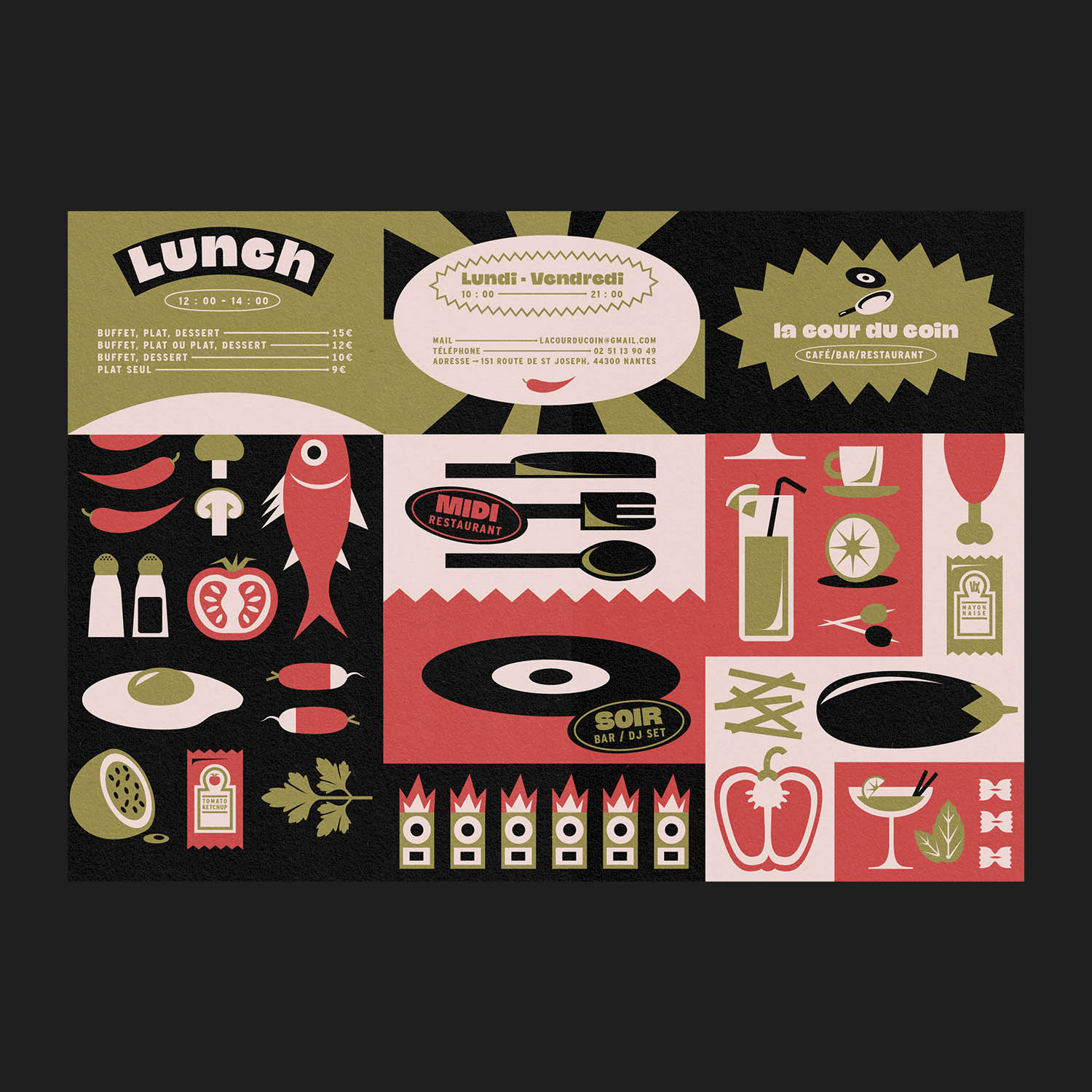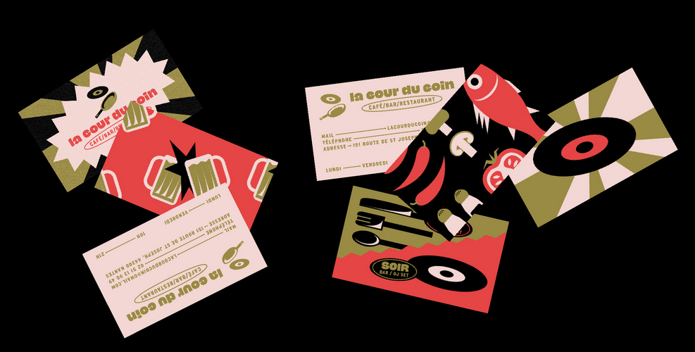 La Cour du Coin, c’est le lieu rêvé des audiophiles mordus de cuisine généreuse. Depuis son ouverture en 2020, Arthur et Simon régalent les palais nantais à travers des plats et une sélection de vinyles incitant au voyage. Ils nous ont laissé carte blanche pour créer une identité visuelle qui reflète la générosité de leur cuisine et l’originalité de leur concept.